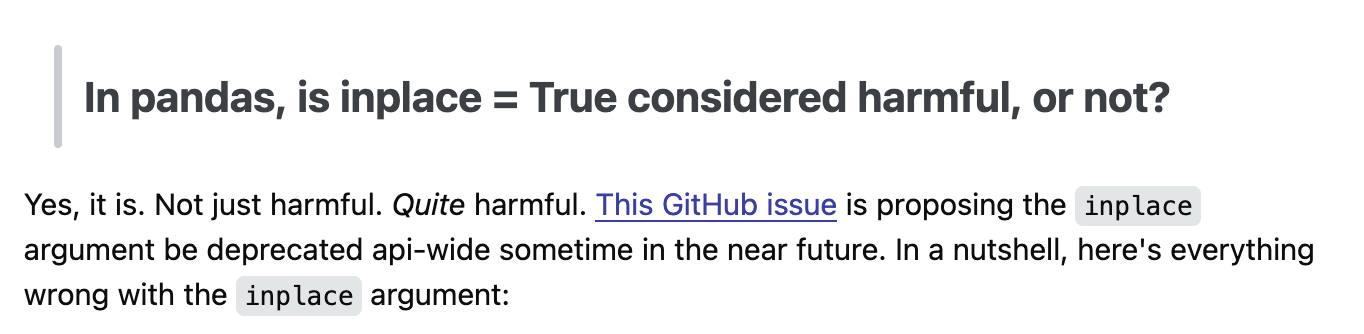 Unfortunately, pandas is almost 20 years old, and mistakes were made during the young years. Sadly enough, this mistake still haunts us to this day because some people are clearly not able to perform a simple Google search. We are still stuck with this because removing it would break half of the world’s code bases, because of people like you. People who think they are being clever, when in fact they’re just performing a major enshittification of the code at a large scale.